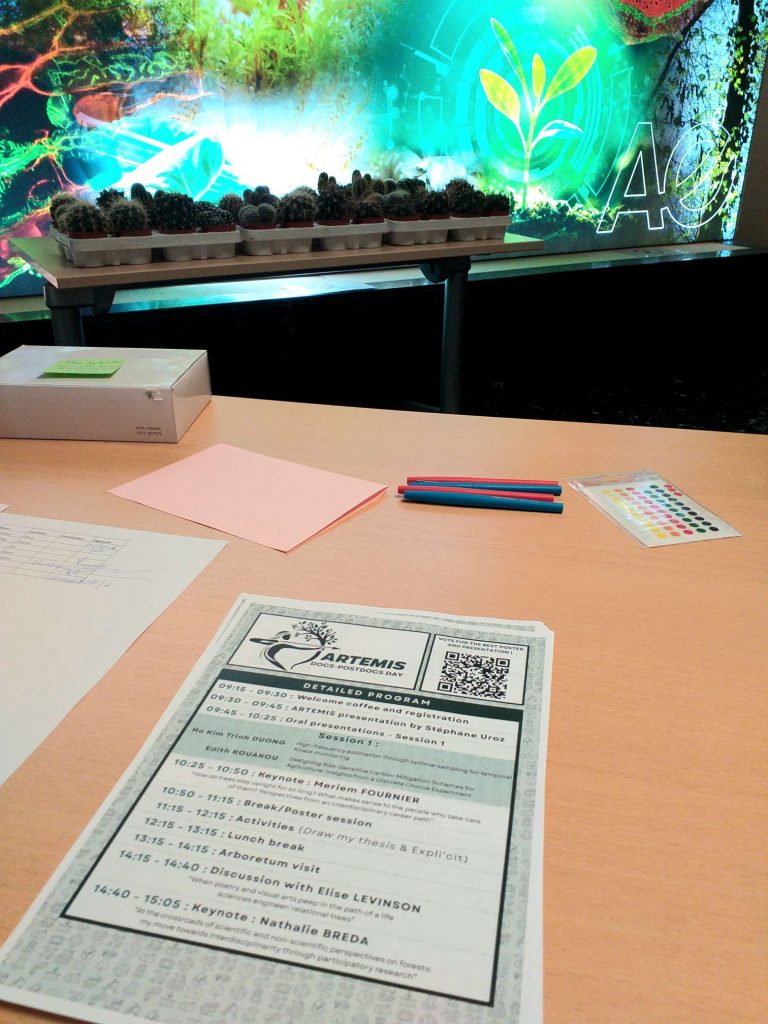 Octobre 2025 : intervention sous forme d’une conférence-échange auprès des 40 doctoran.tes et post-doctorant.es du programme de recherche interdisciplinaire ARTEMIS, sur le site d’INRAE Champenoux. J’y ai témoigné de la façon dont ma pratique artistique, s’immisçant dans mon parcours d’ingénieure, est venue transformer mon rapport à l’arbre et à la forêt 🌳 Poétiser, tracer des lignes, poser de la couleur, m’a amenée ces dernières années à reconsidérer les arbres et la forêt : pas seulement comme notre « environnement », décor et ensemble d’objets-ressources extérieures à nous, à « gérer » pour assurer nos propres besoins, mais également comme êtres vivants ayant des points de vue singuliers sur le monde, potentiels alliés, compagnons de vie et de coopérations/alliances pour assurer (voire régénérer) l’habitabilité de nos territoires…